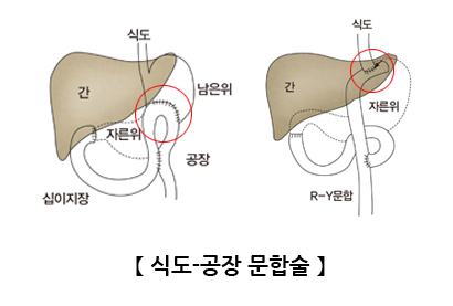 위를 전절제하는 경우 십이지장의 절단면을 닫고 식도와 공장을 직접 연결하는 방법으로 루와이 식도 공장 문합술이 있습니다. 식도와 공장이 문합된 부위로부터 40~60cm 아랫부분에 십이지장 내의 담즙과 췌장액이 빠져나올 수 있도록 공장의 길을 만들어 연결합니다. 이 방법의 경우 담즙의 길과 식도와의 거리가 멀기 때문에 역류성 식도염의 발생 가능성이 줄어듭니다. 그러나 식후 바로 누우면 음식물이 역류할 수 있으므로 앉거나 가벼운 운동을 하도록 합니다.