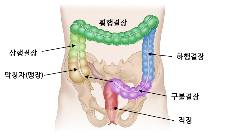 대장의 대부분을 차지하며 상행결장, 횡행결장, 하행결장, S상결장으로 분류할 수 있습니다.
