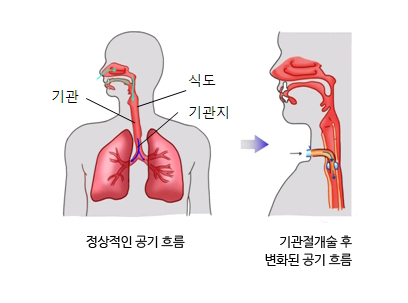기관의 상부가 막히게 되면 호흡이 힘들어져 생명에 위협을 초래합니다. 이물질이나 분비물에 의해 기관이 막히거나 좁아지면 공기의 흐름이 원활하지 않기 때문에 폐로 공기가 들어갈 수 있도록 목에 작은 구멍을 만드는데, 이를 기관절개술이라 합니다. 구멍을 통해 기관절개튜브를 삽입하면 공기의 통로가 확보되어 코로 숨쉬기 어려운 경우에도 호흡이 가능하도록 도와줍니다. 또한 이 통로는 자발적으로 기관지 속의 분비물을 제거할 수 없는 환자에게 가래를 제거하는 통로로 이용되기도 합니다.