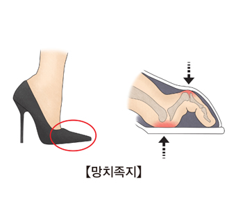 조갑감입이란 발톱의 양끝이 살을 파고드는 것을 말하는데, 주로 엄지발가락에 많이 생기며 재발이 잦습니다. 자신의 발 크기보다 작은 신발을 신거나 발톱을 짧게 자르거나 혹은 발톱에 강한 압력을 받는 운동선수나 군인, 높은 하이힐을 신는 여성도 내성발톱이 생길 수 있습니다. 증상이 경미할 때에는 발톱을 너무 짧게 자르지 말고 발톱 모양을 일자로 유지하는 것이 좋은데, 이로 해결이 되지 않을 때에는 발톱이 살을 파고들지 않도록 시술을 받거나 발톱을 제거하는 경우도 있습니다. 특히 당뇨병을 앓는 환자는 발의 질환에 대해 항상 조심하고 예방하여야 합니다.