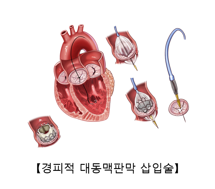 최근에는 수술 위험도가 높은 환자를 대상으로 비수술적 치료인 경피적 대동맥판막 삽입술(TAVI or TAVR)을 시행합니다. 대퇴동맥 혹은 심첨부를 천자하여 카테터로 대동맥판막에 접근하고, 생체 조직으로 만든 조직 판막을 삽입합니다. 경피적 대동맥판막 삽입술의 성공률이 높아지고 판막의 내구성이 보강되면서 점차 시술의 효과가 높아질 것으로 예상됩니다.