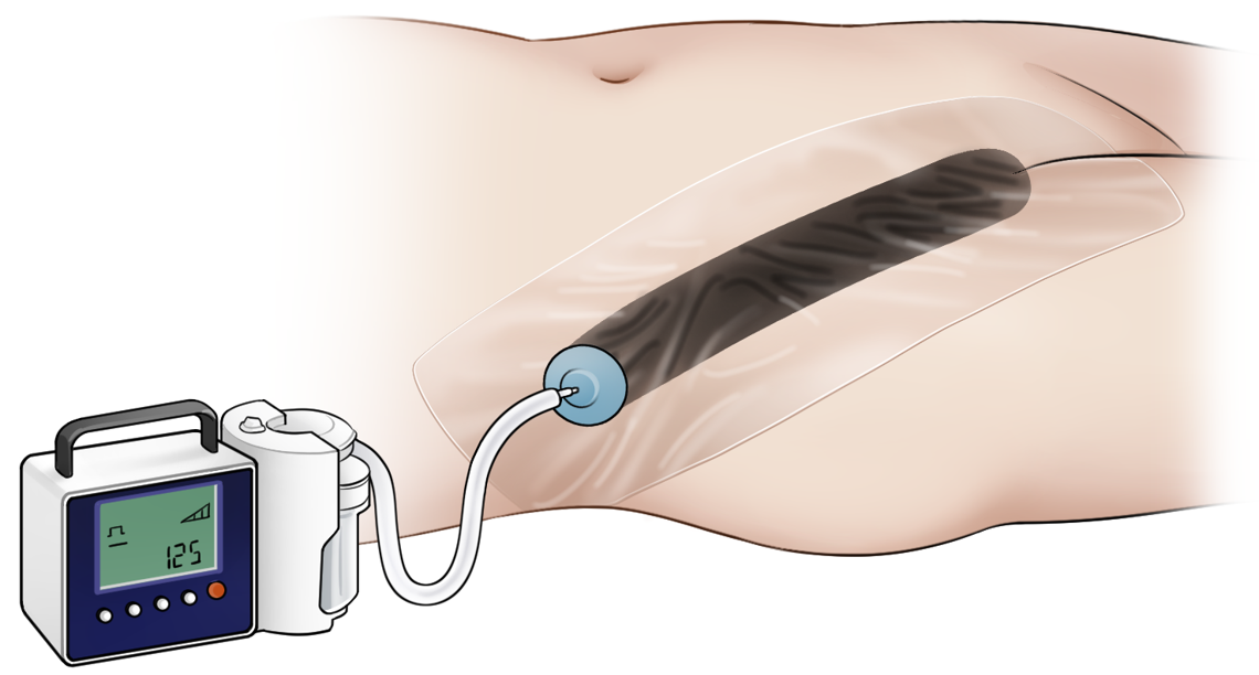 ④ 이식한 피부가 움직이지 않고 결손 부위 바닥에 잘 붙어 살아날 수 있도록 거즈를 실로 묶어 고정하는 드레싱(tie-over dressing)을 시행하거나 음압장치를 이용한 드레싱을 시행하게 됩니다(NPWT: negative pressure wound therapy).