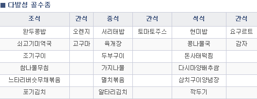 잡곡, 견과류, 두류, 다양한 색의 채소 및 과일류