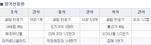 2. 식사양이 줄어 열량 섭취가 줄면 체조직이 분해되어 체중이 감소하고 노폐물이 쌓이게 되므로 밥 1공기 정도의 충분한 식사량을 유지합니다.